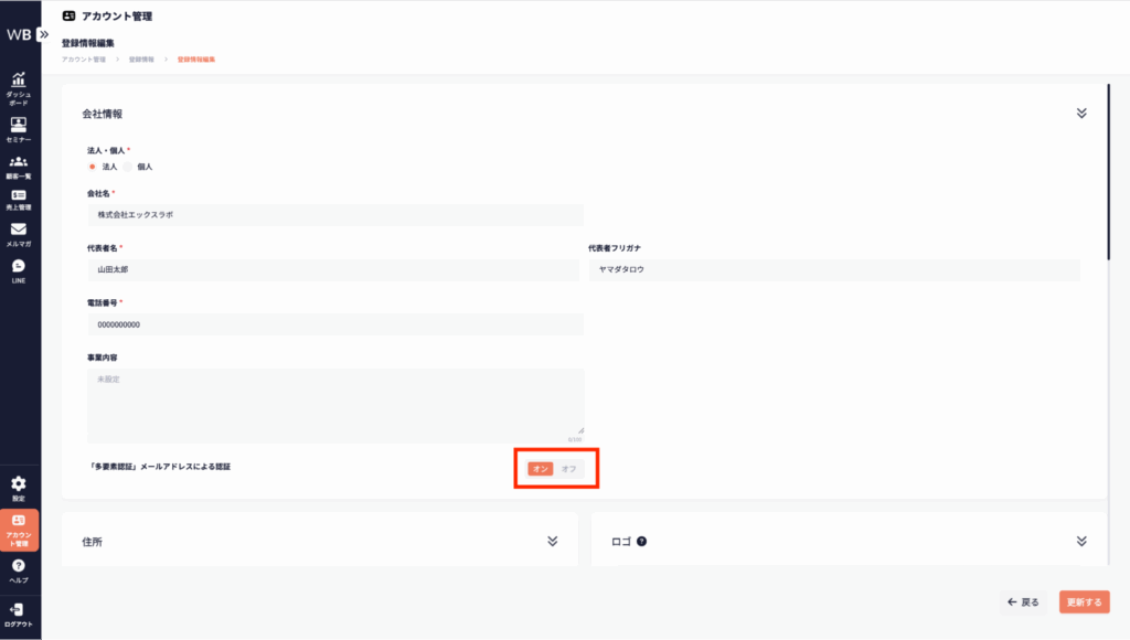 多要素認証は、セキュリティ設定画面からいつでもオン・オフの切り替えが可能です。