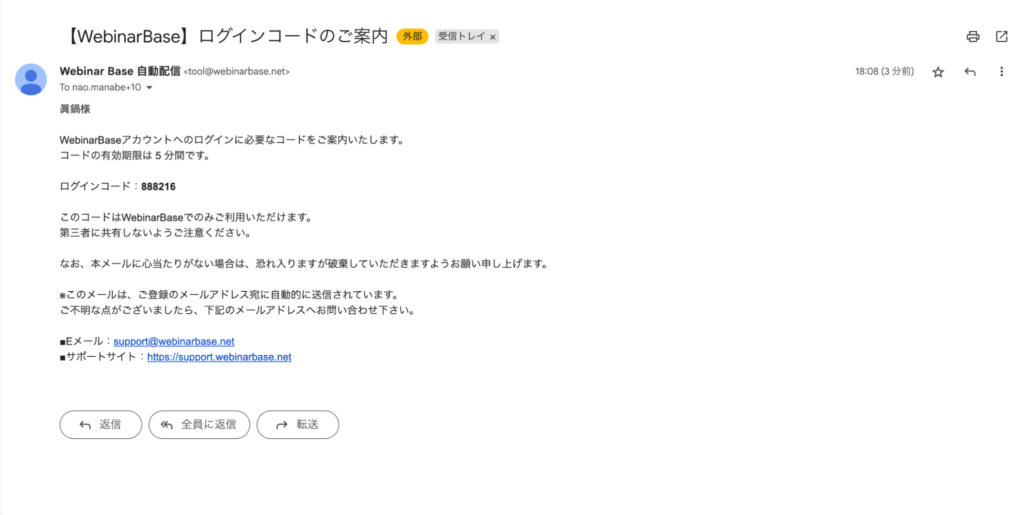件名は「【WebinarBase】ログインコードのご案内」です。
