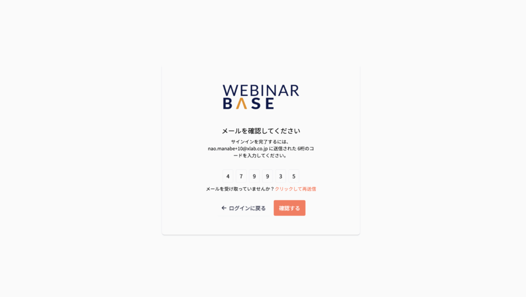 ③確認したログインコードを、WebinarBaseのログイン画面に入力する