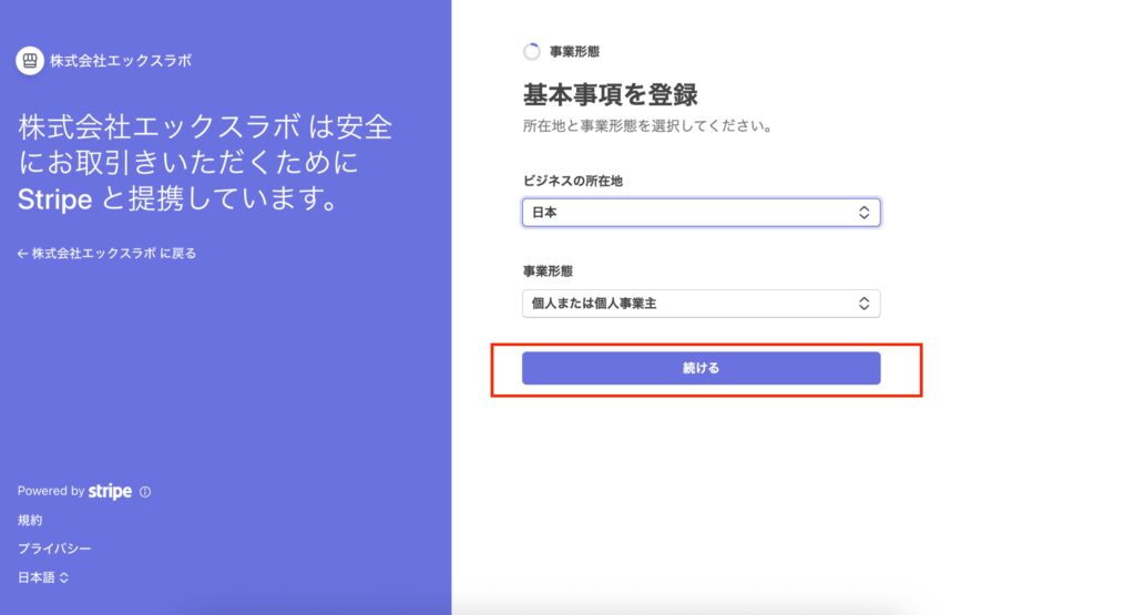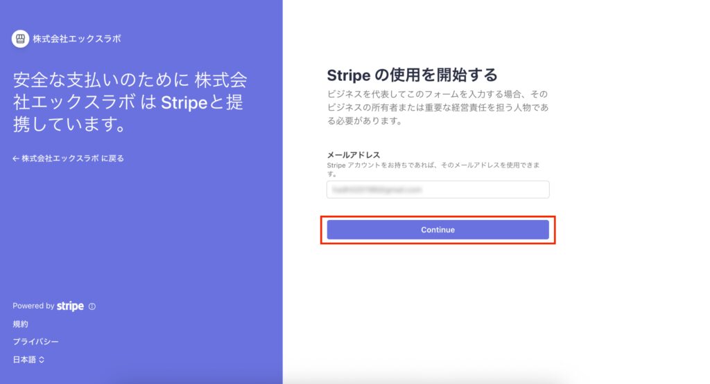 ②登録するメールアドレス、もしくは、Stripeアカウントに登録しているメールアドレスを入力→「continue」をクリックします。