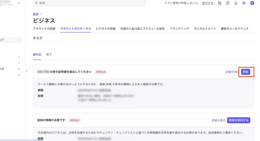 ⑦身分証明書を提出するため、「開始」をクリックします。