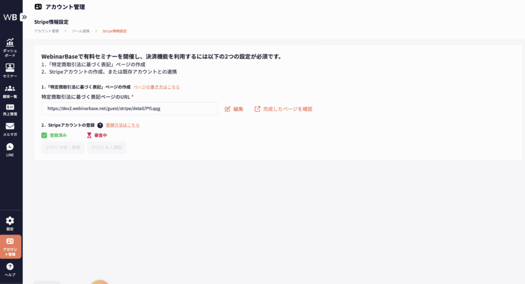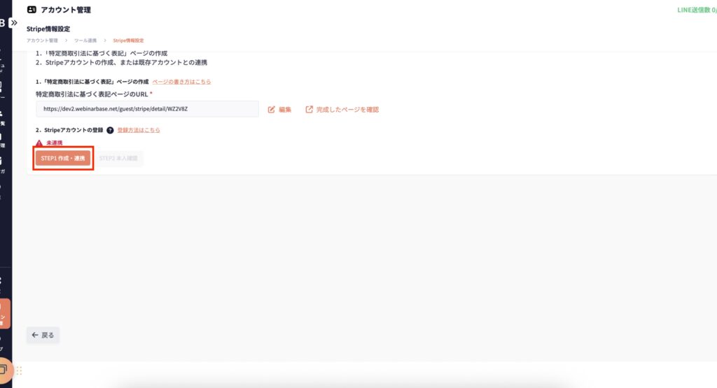 STEP1の途中でリロードしてしまった、タブを閉じてしまったなど、何らかの理由でSTEP1が途中で続行できなくなった場合は、WebinarBaseの「アカウント情報」→「ツール連携」→「Stripe」と進み、画面下部にある「連携がうまくいかない場合」をクリックし、記載の内容で再度確認してください。
