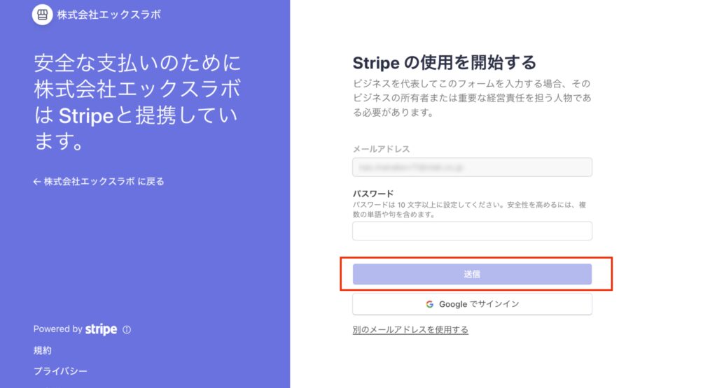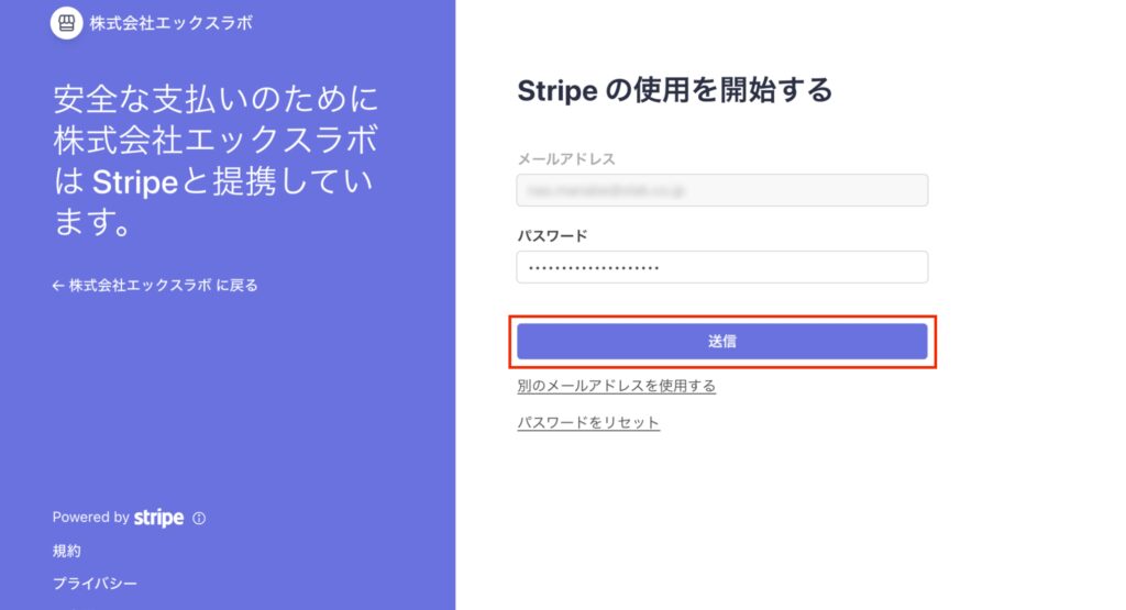 ①Stripeに登録するメールアドレスとパスワードを入力し、「送信」をクリックします。