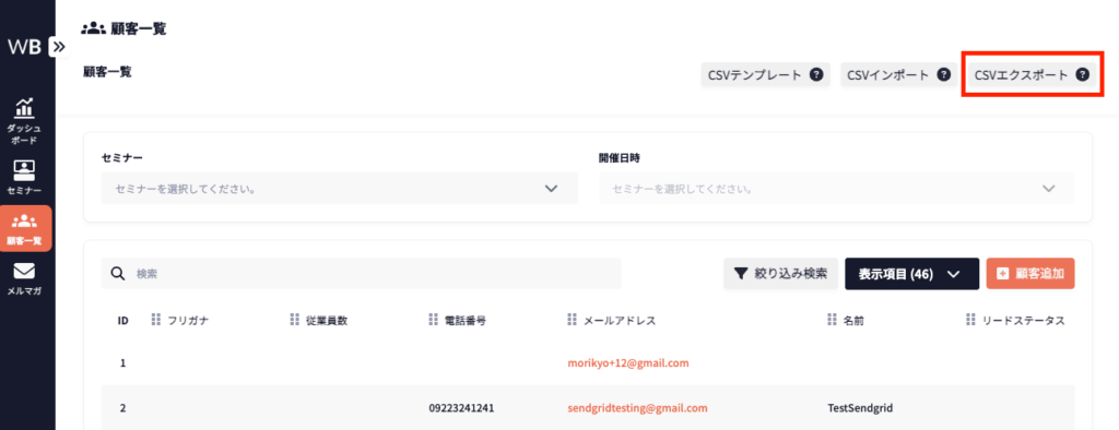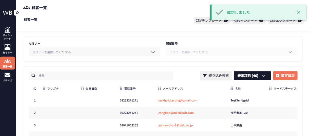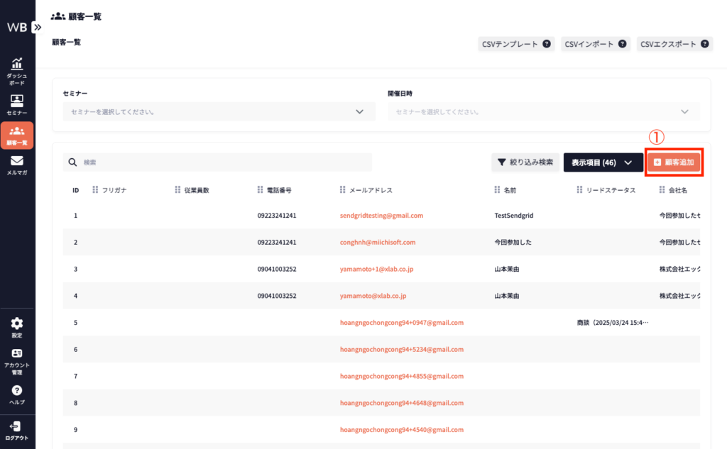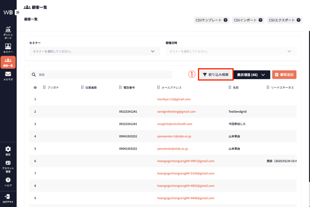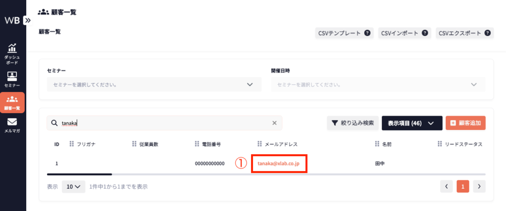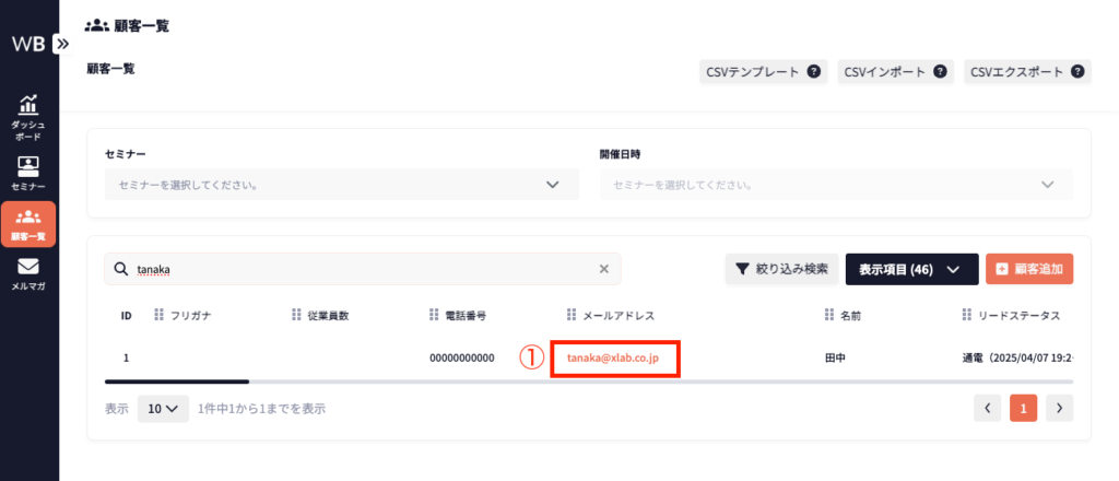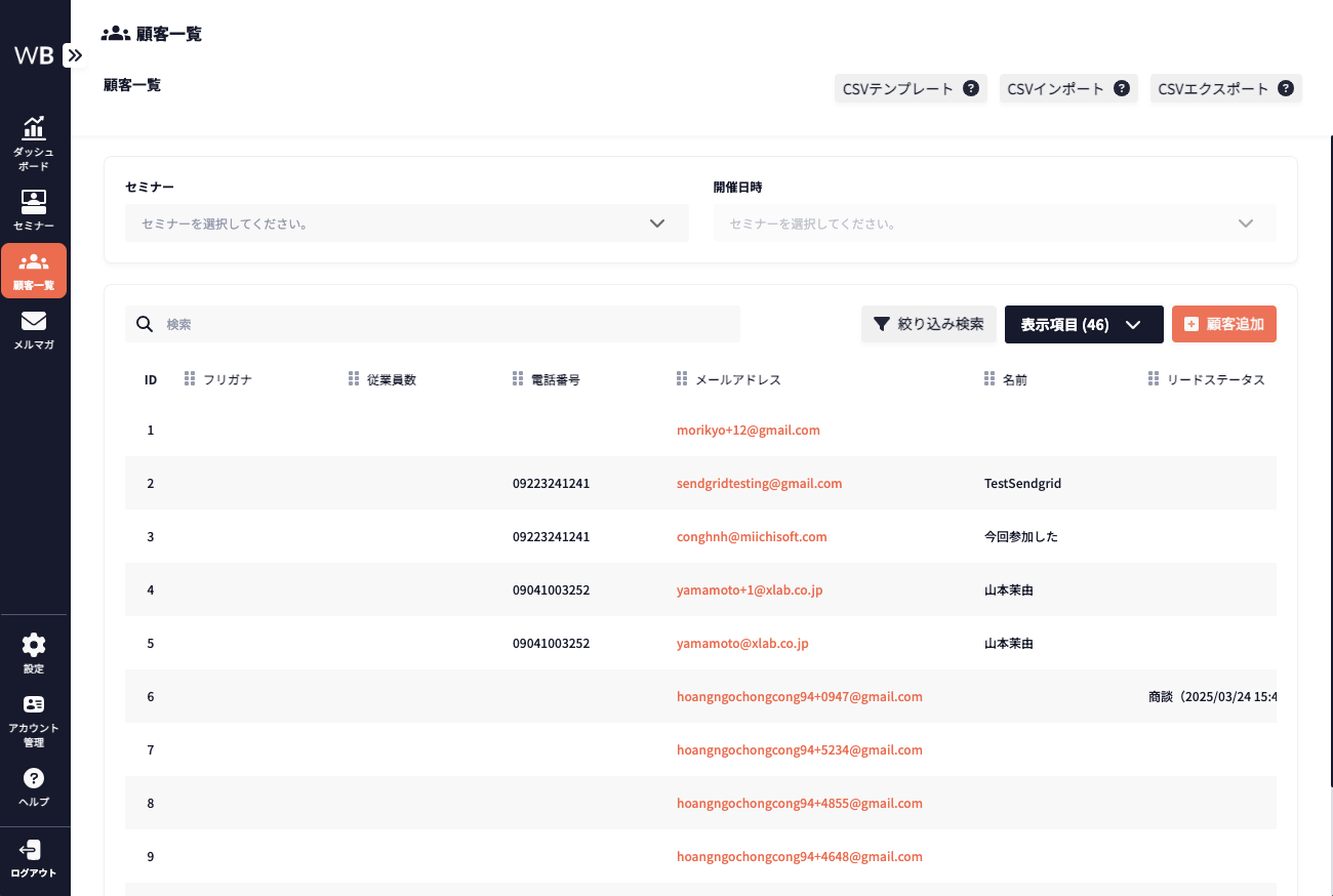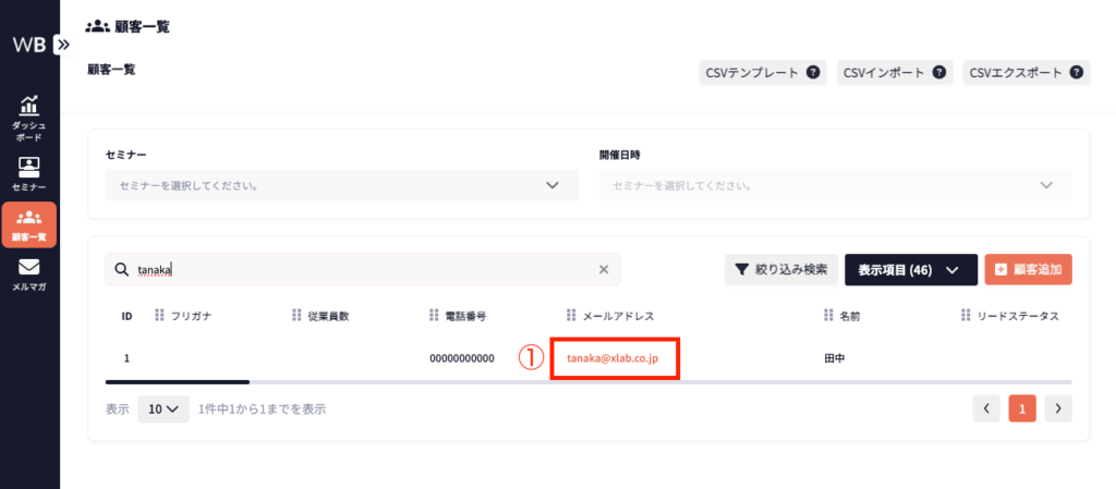 「顧客一覧」では、セミナー参加者や見込み客の情報を一元管理できます。