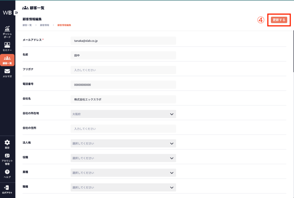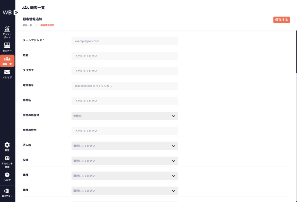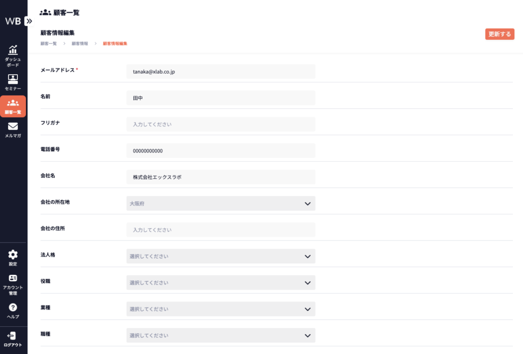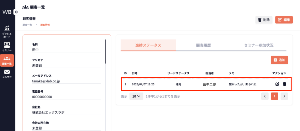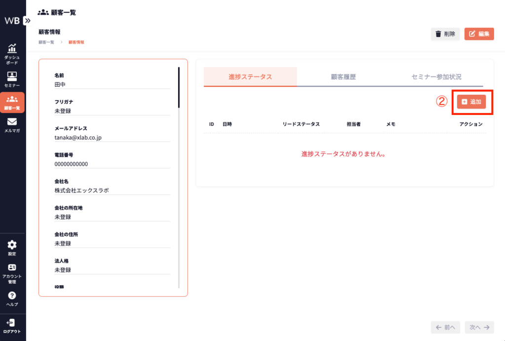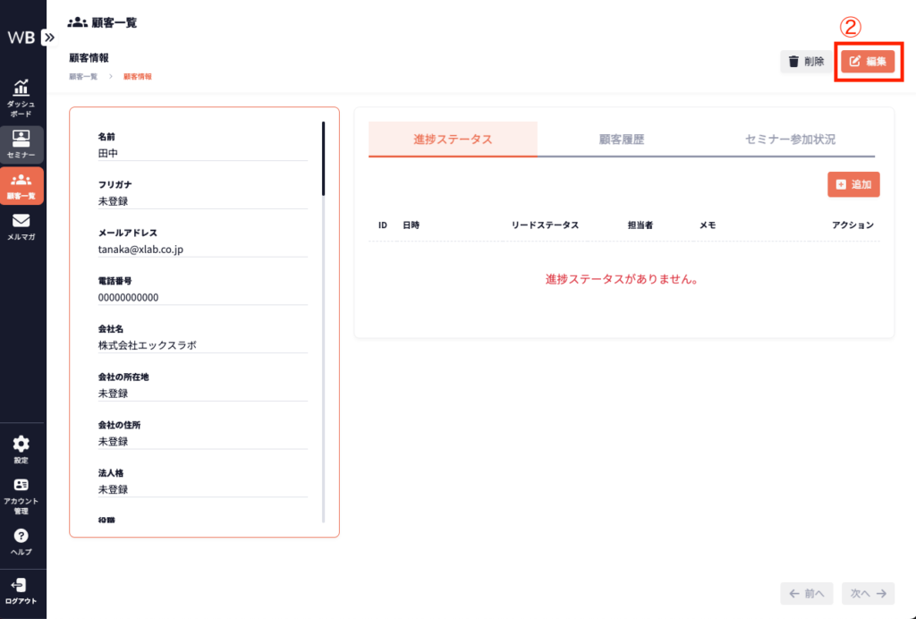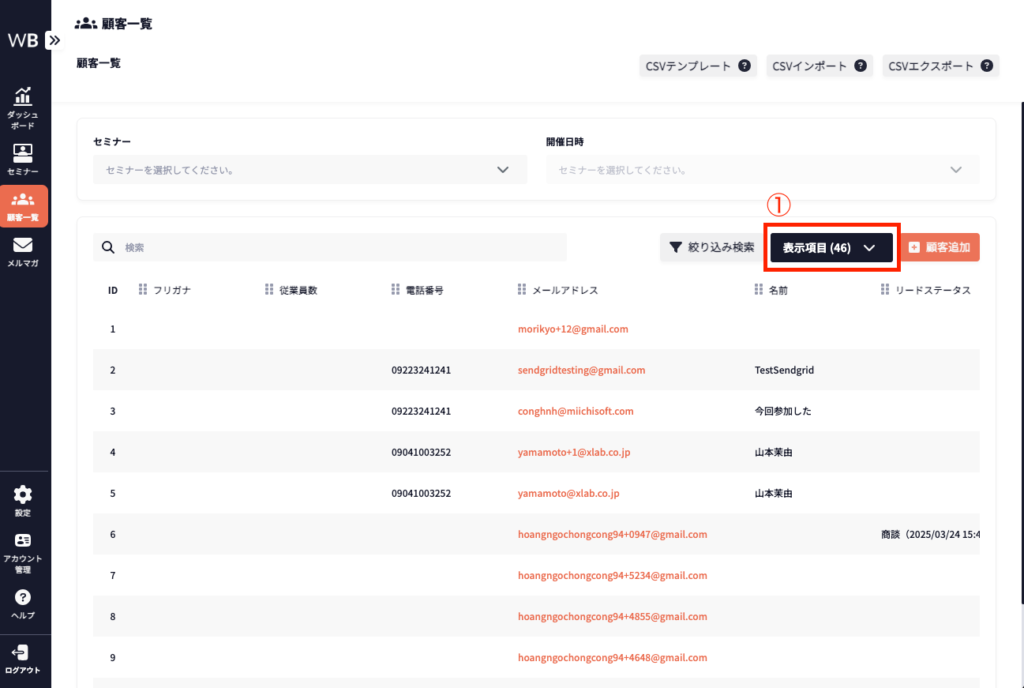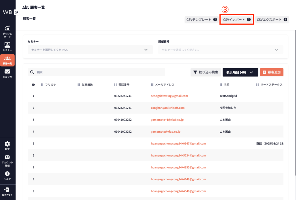 「顧客一覧」では、セミナー参加者や見込み客の情報を一元管理できます。
