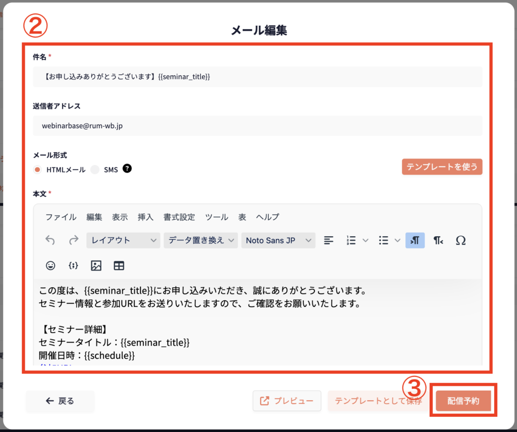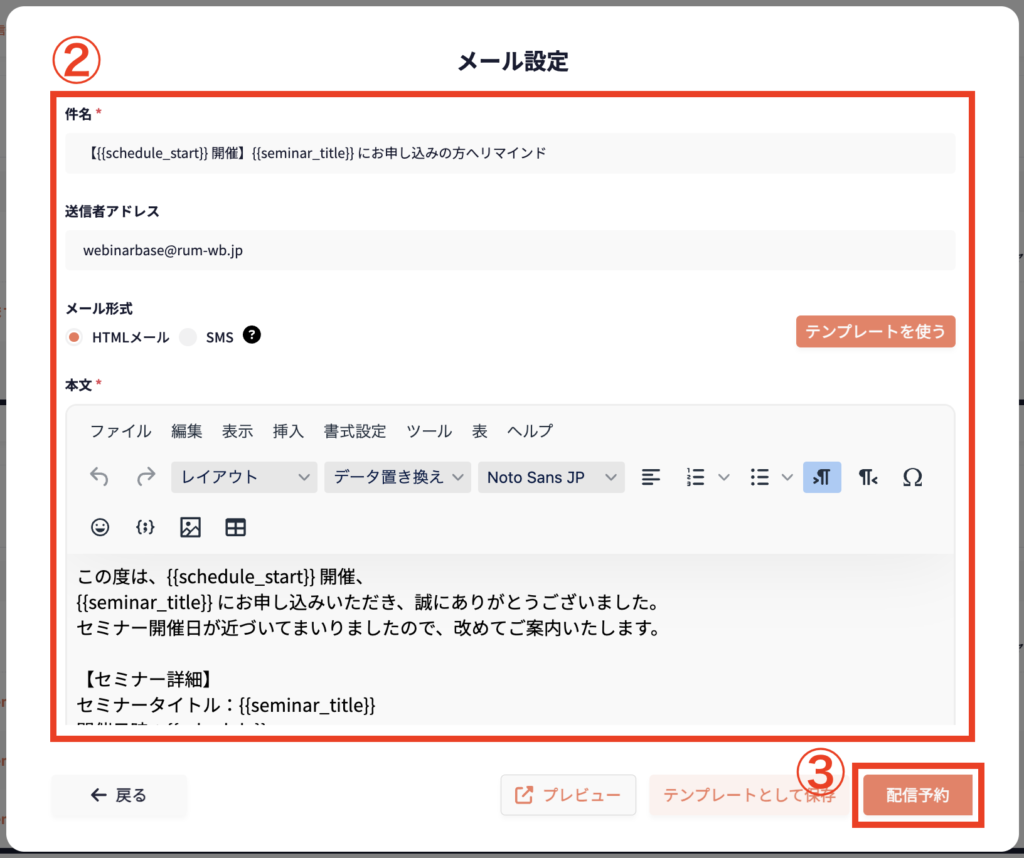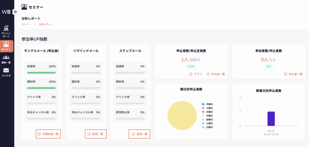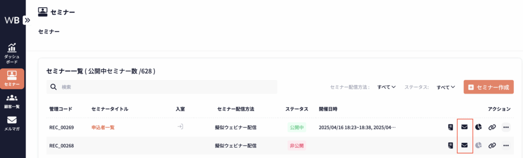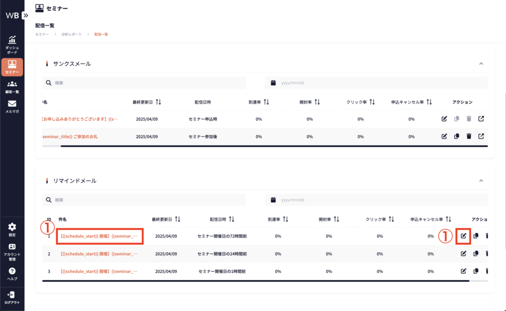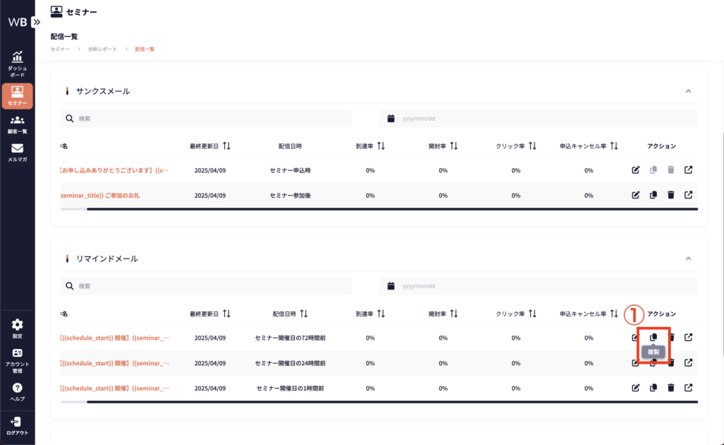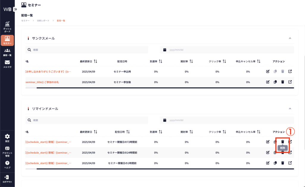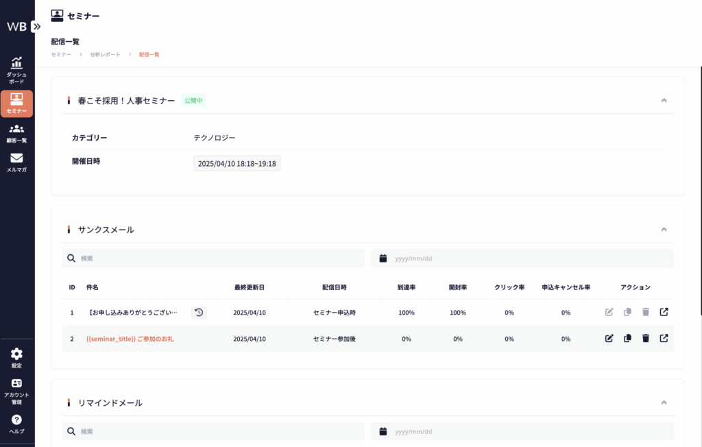 配信一覧では、セミナーごとに配信したメールの分析データを確認できます。
