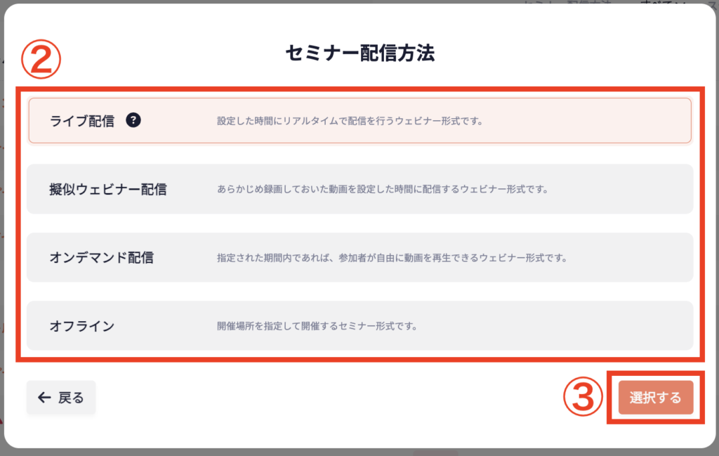 ② セミナー配信方法を選択する