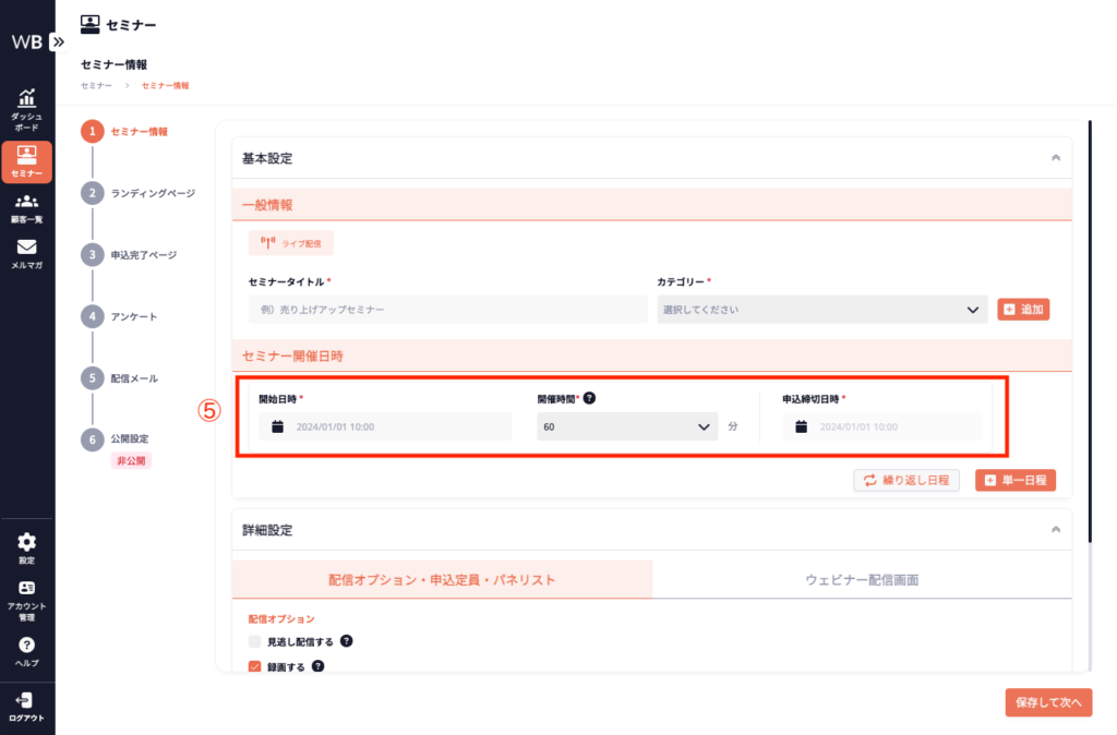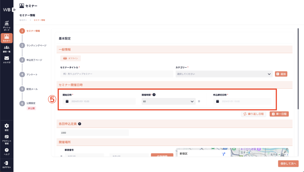 ⑤ [セミナー開催日時]を入力する