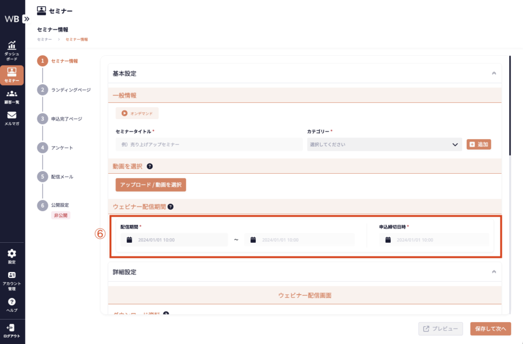 ⑥ [ウェビナー配信期間]を入力する