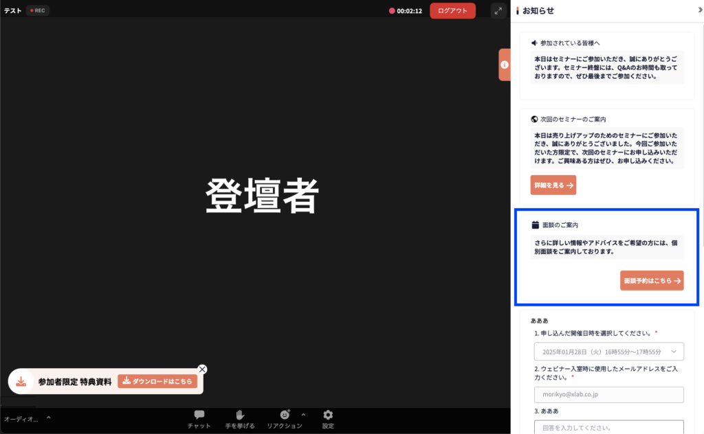 ウェビナー開催中に参加者が面談予約できるようになります。