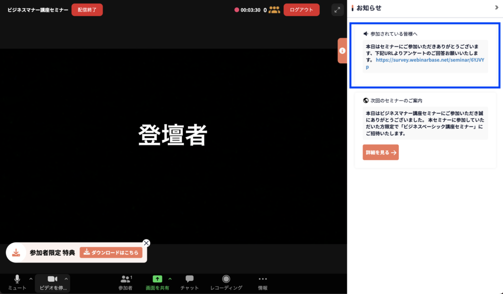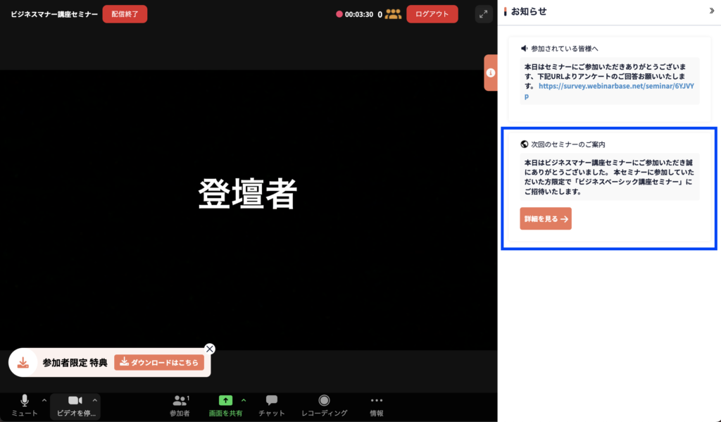 また、次回のウェビナー予告や関連イベントの告知をすることで、開始までの時間を有効活用でき、効果的な情報発信が可能です。