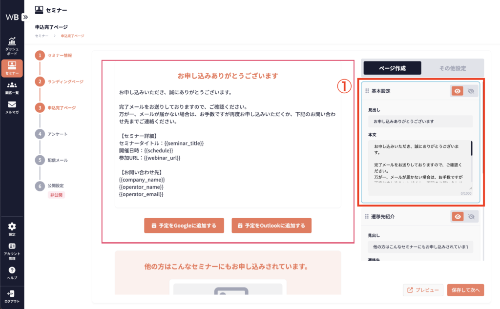 ここでは、以下の手順で申込完了ページの設定方法について説明します。