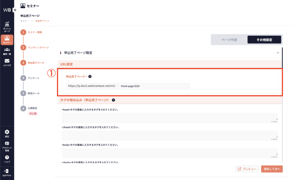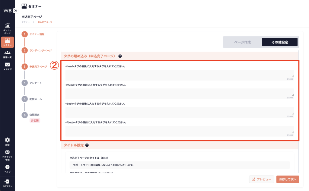 ランディングページと申込完了ページそれぞれのコードやmeta情報など、作成以外に必要な設定は、[その他設定]から行えます。詳細は以下に記載しています。