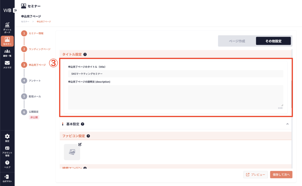 ③ 申込完了ページのタイトル(title)と説明文(description)を入力する