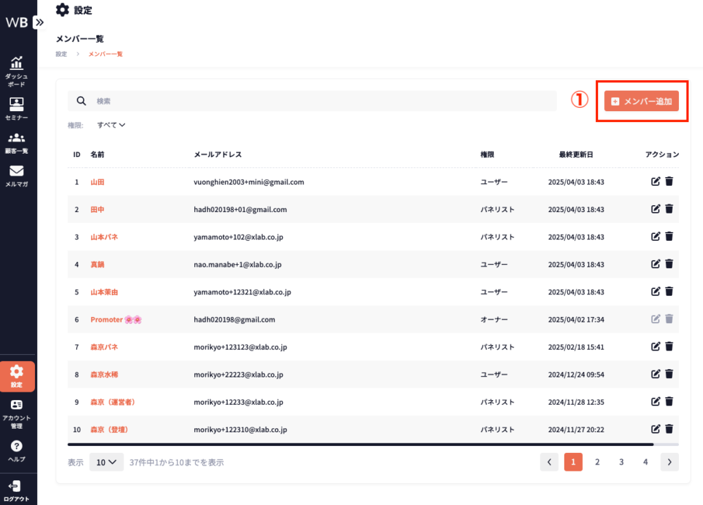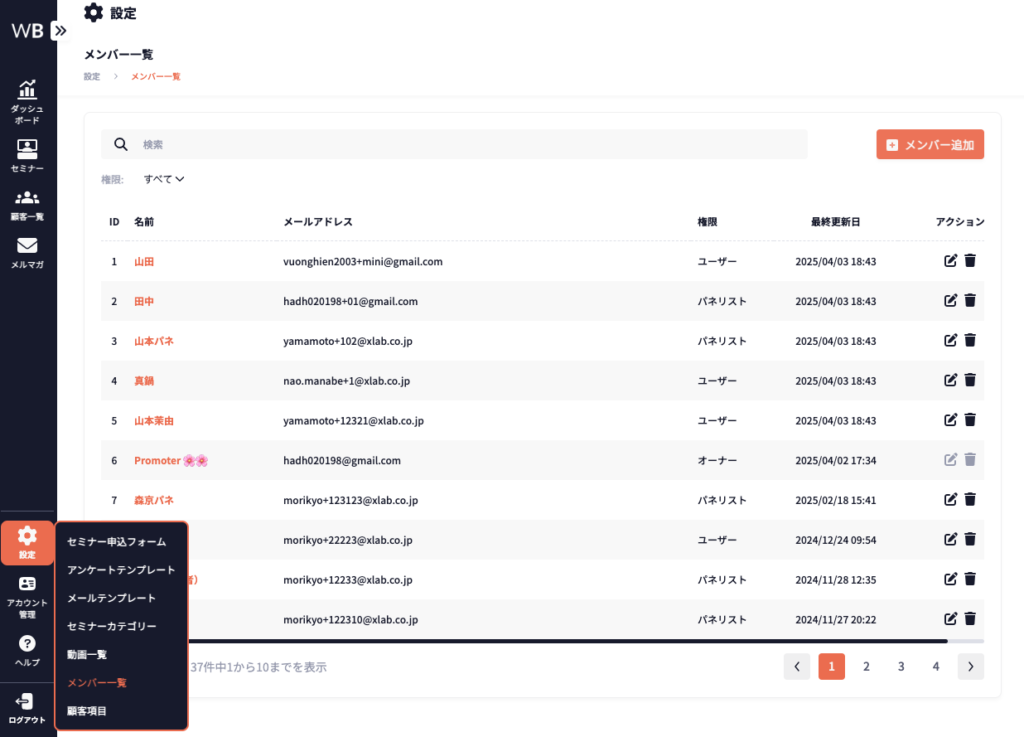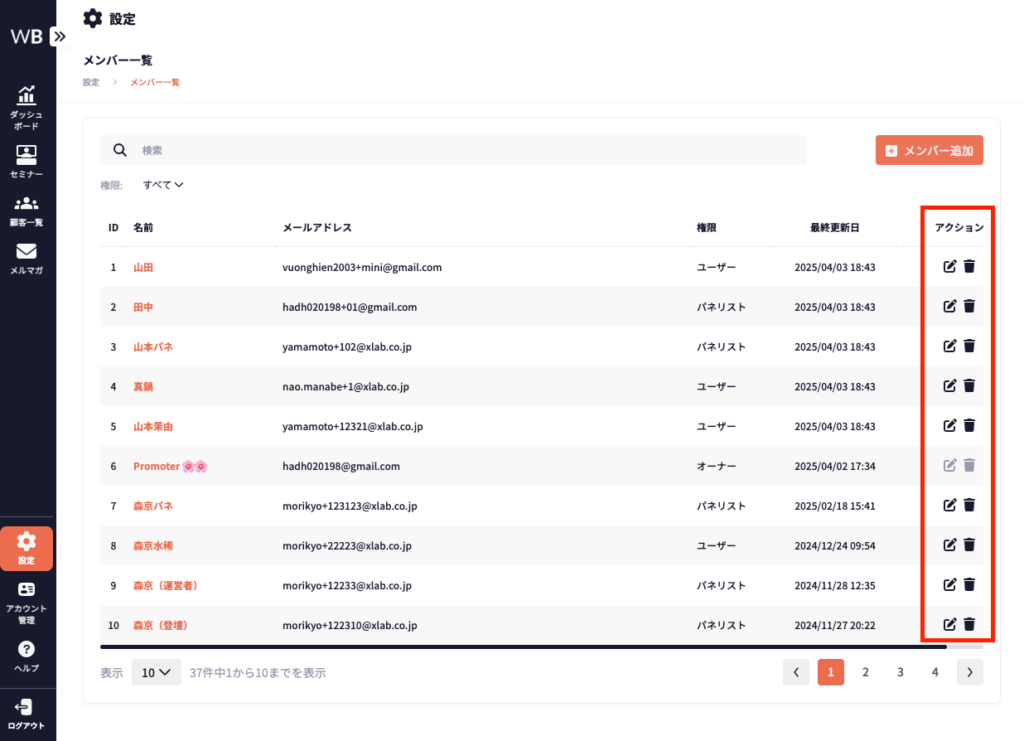 メンバーの編集、削除は、一覧ページから行うことができます。
