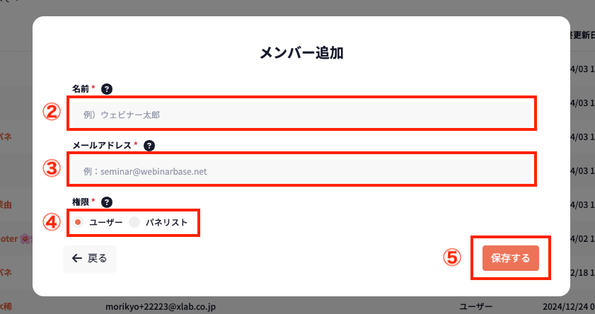 WebinarBaseでは、ウェビナーの運営に関わるメンバー(ユーザーやパネリスト)を管理するための機能が用意されています。このページでは、メンバーの役割と権限、追加・編集・削除の手順について説明します。